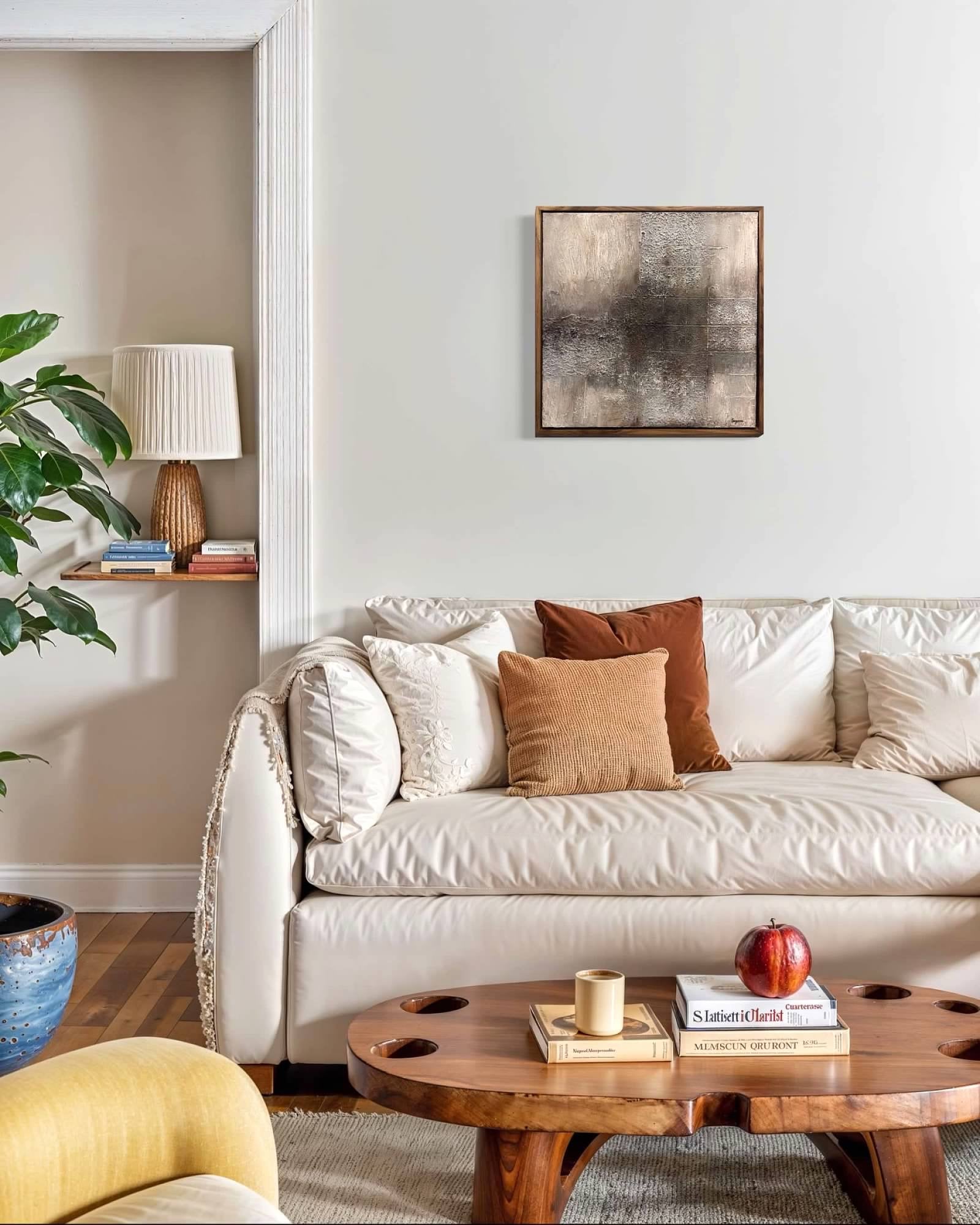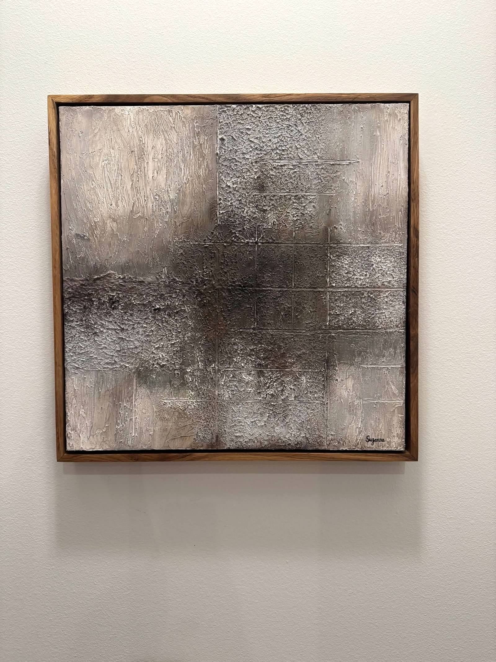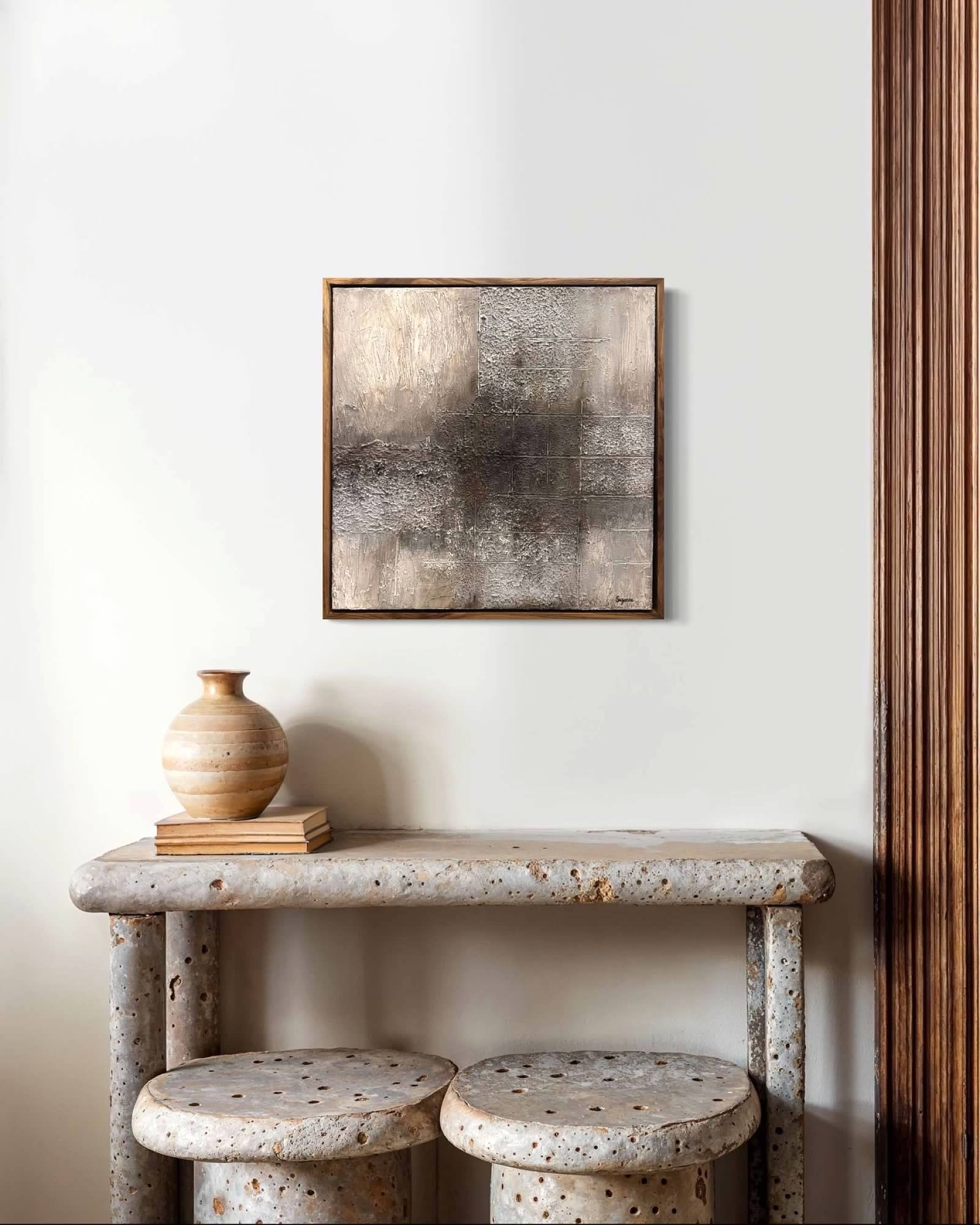 Elevate your space with "Urban Grid," a compelling 20x20 heavily textured acrylic painting that serves as a sophisticated focal point. Encased in a refined, natural Oak wood floating frame, this original artwork combines the raw, sculptural quality of industrial design with the timeless elegance of a neutral palette.