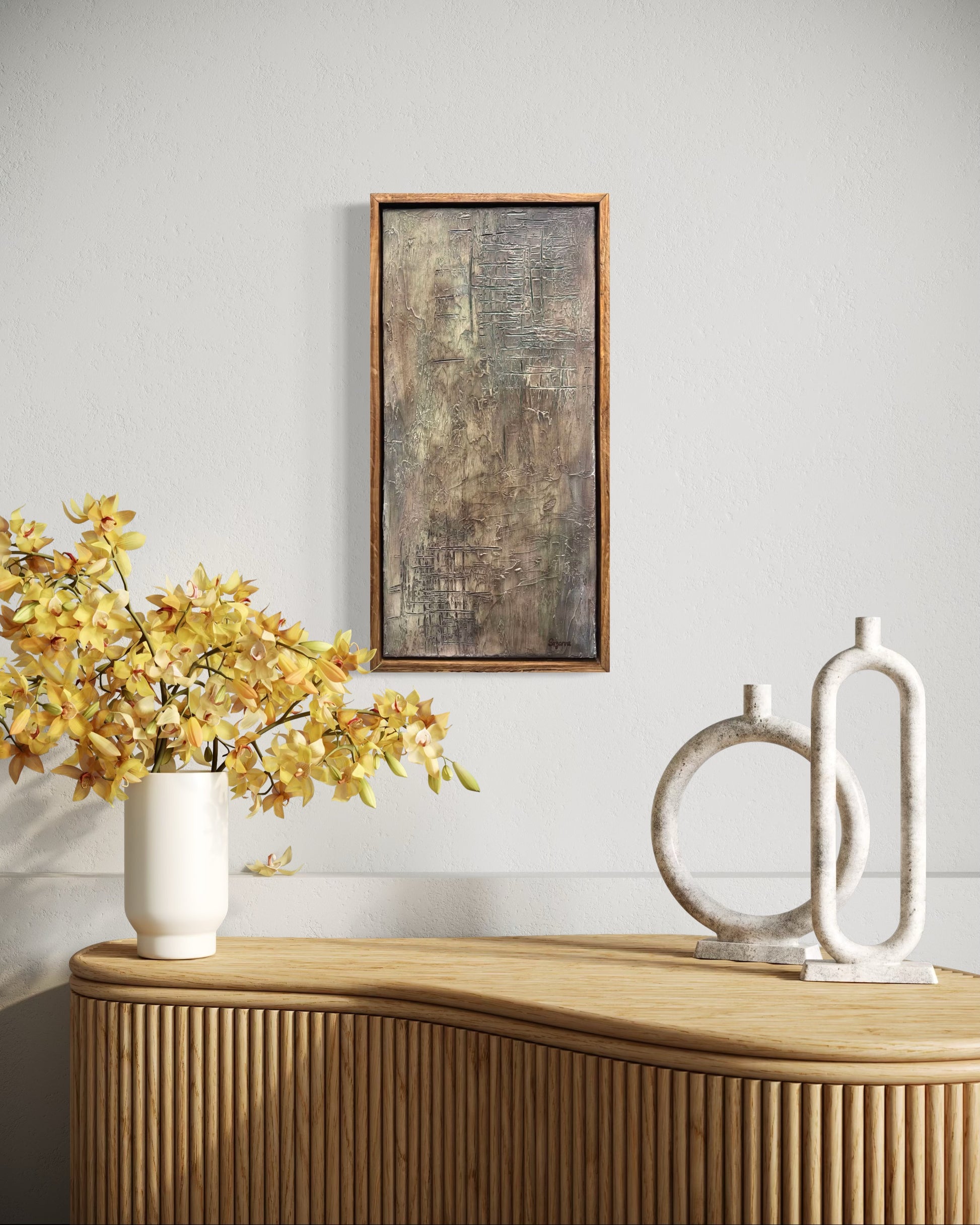 This painting is ideally suited for adding sophistication and visual interest to vertical spaces, such as a hallway, a kitchen pillar, or between windows. Its natural, balanced palette makes it highly versatile, pairing beautifully with rustic, industrial, and contemporary interior design styles.