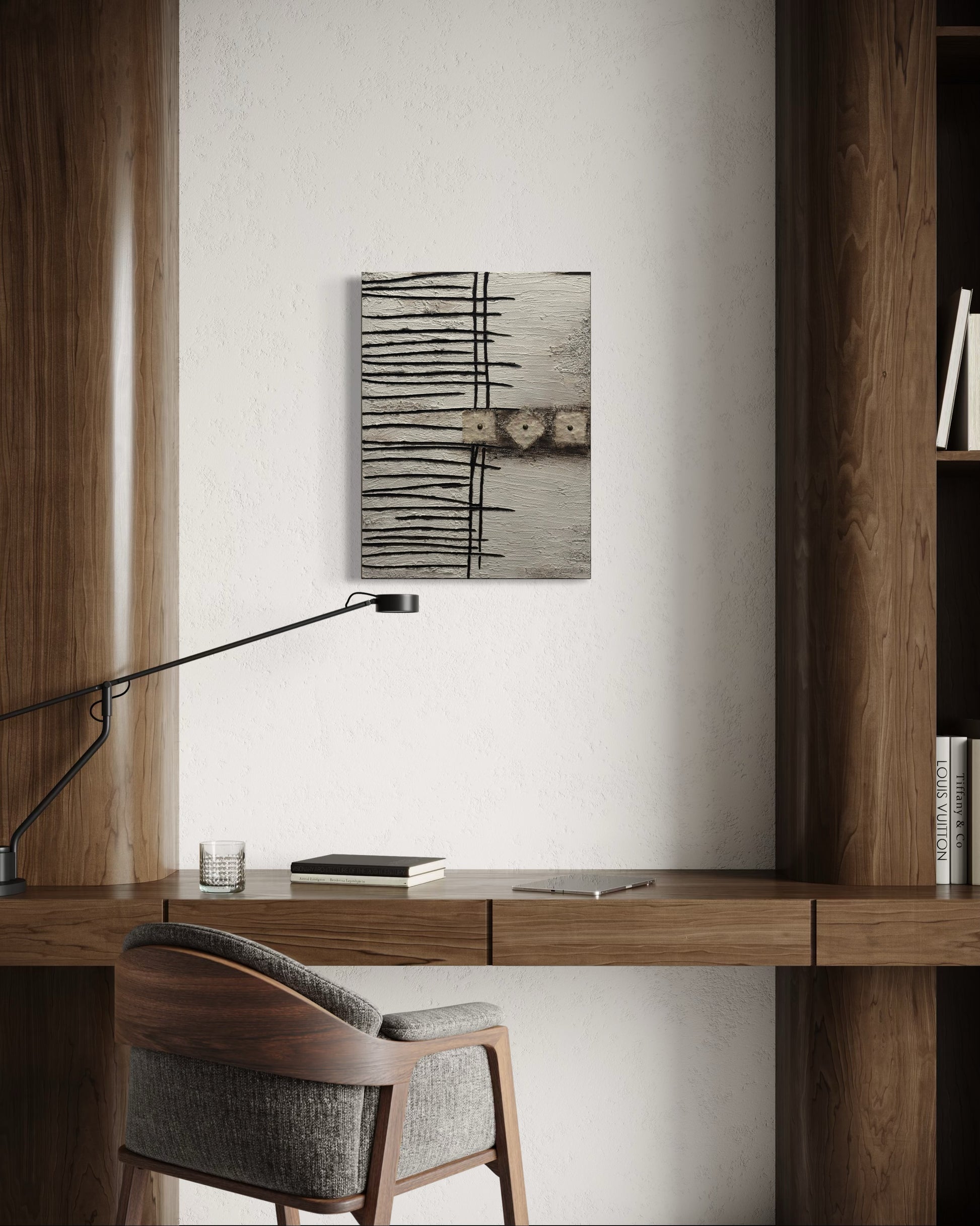 Bring bold sophistication into any space with this one-of-a-kind mixed-media abstract. Created on a solid 18x24 wood panel, this piece blends rich texture, organic movement, and modern minimalism into a striking statement artwork.