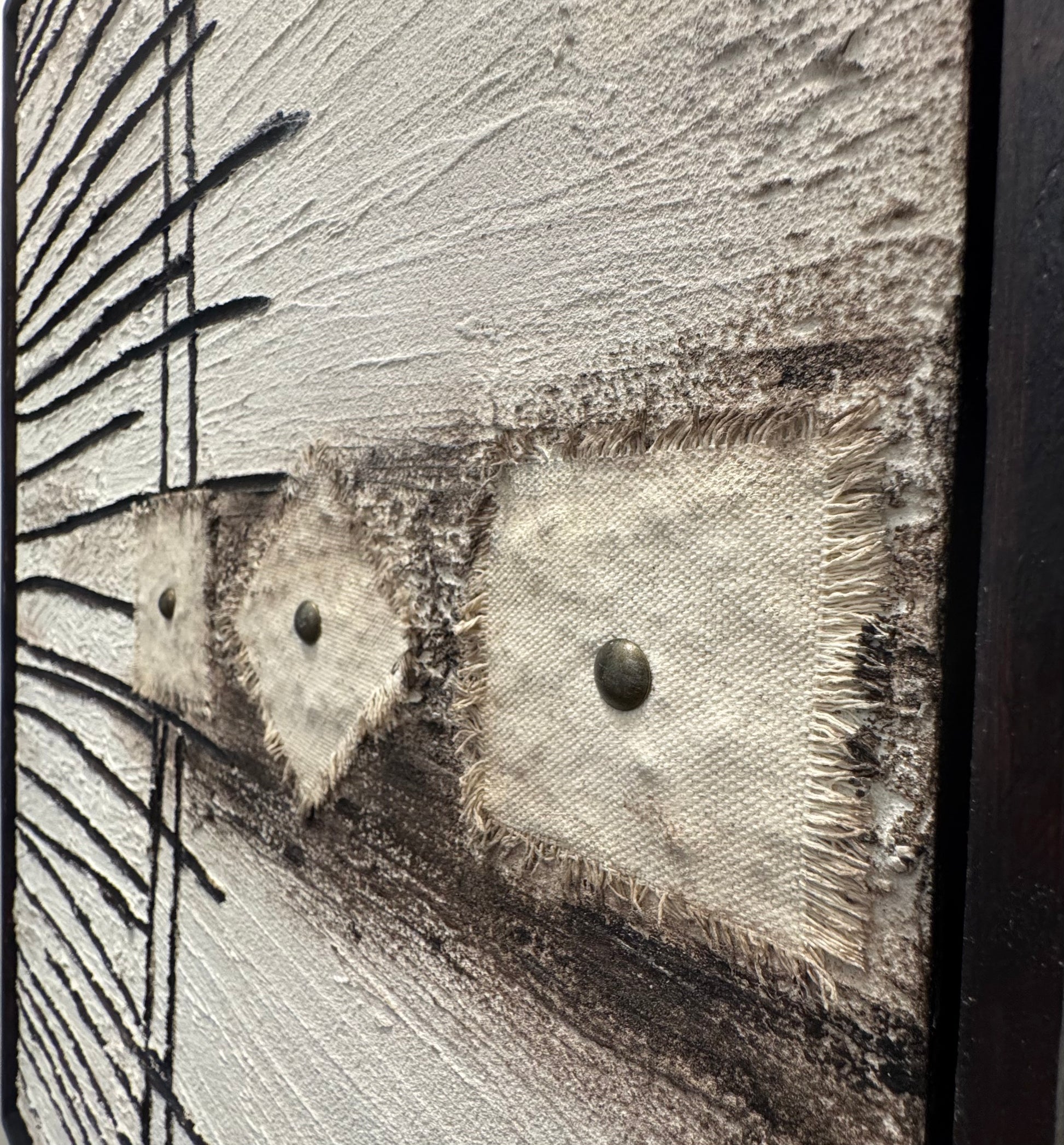 Hand-textured acrylic layers form a soft neutral backdrop, while bold dark sepia linear marks introduce rhythm and contrast. A band of raw canvas secured with antique-style upholstery nails adds an unexpected tactile element that nods to both craftsmanship and contemporary design.