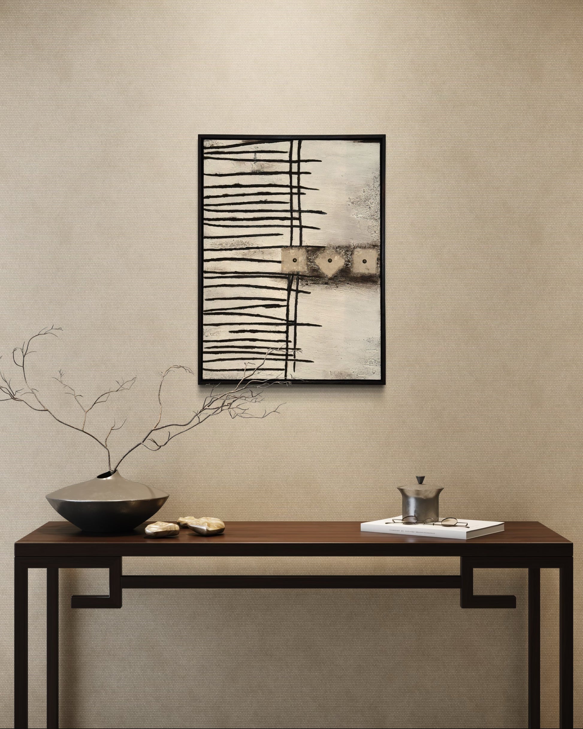 This piece is the perfect blend of modern composition and earthy authenticity. The intersecting lines create movement and depth, while the natural canvas elements ground the piece with warmth and character. It pairs effortlessly with neutral interiors and adds sophisticated structure to gallery walls.